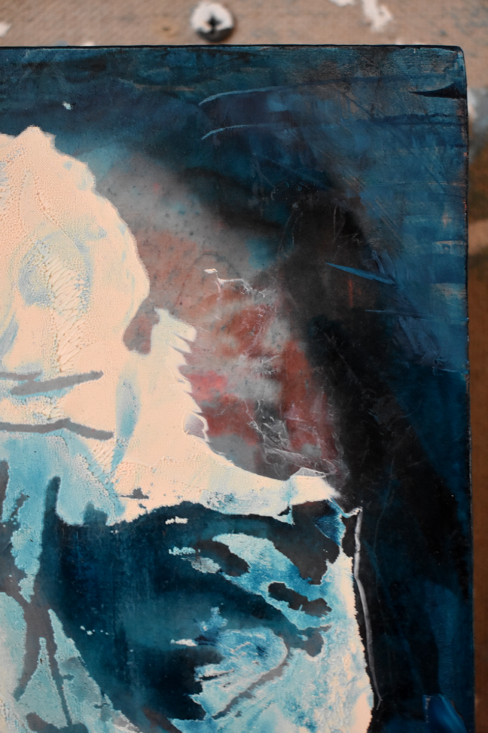 The techniques involved in these paintings begin with preparatory drawings sketched in charcoal using film stills for reference material, as a nod to contemporary American mythos. The drawing is then scanned, printed as a negative, and exposed onto a photosensitive silkscreen which provides an integral tool for creating the overall layered effect. An intentionally blurred portrait forms the base layer of the painting. The silkscreen is applied over the blurred image, creating a tension between the layers: one soft, one hard-edged. Parts of the portrait are reworked “realistically”, as needed, to emphasize an inferred psychology in the subject. Palette knifing is applied throughout the process, building atmosphere within the composition.